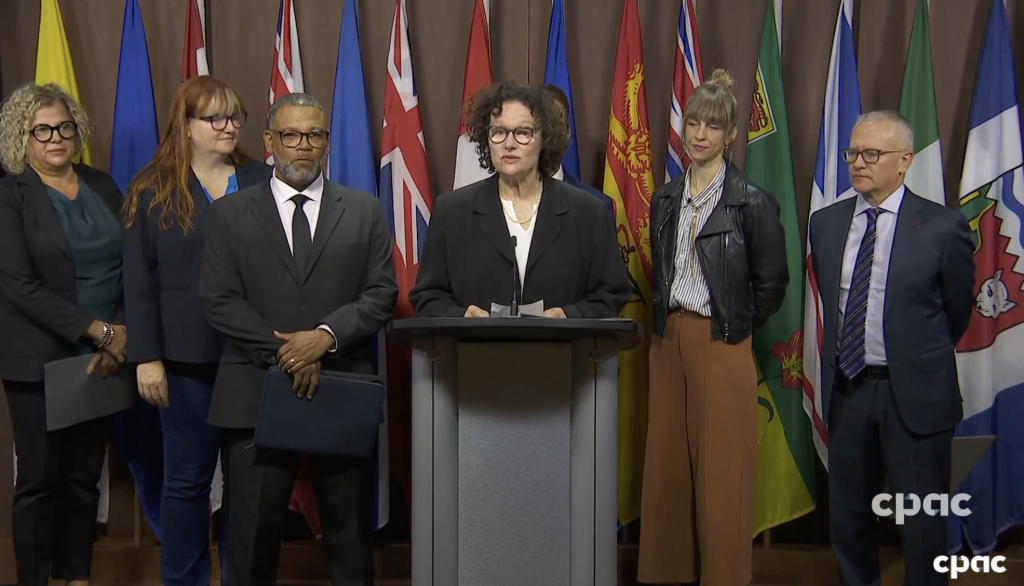 Jason MacLean, président de la Coalition canadienne de la santé, s’adresse à une conférence de presse nationale, accompagné (de gauche à droite) d’Angela Preocanin, secrétaire-trésorière de la Fédération canadienne des syndicats d’infirmières et infirmiers, de Siobhán Vipond, vice-présidente exécutive du Congrès du travail du Canada, d’Olivier Surprenant, analyste en politiques publiques de l’Union des consommateurs, de Frédérique Chabot, directrice générale intérimaire d’Action Canada pour la santé et les droits sexuels, de Manuel Arango, vice-président, politiques de la santé et défense des intérêts pour la Fondation des maladies du cœur et l’AVC du Canada, d’Anne Lagacé Dowson, directrice des médias à la Coalition canadienne de la santé. Photo : Adella Khan.