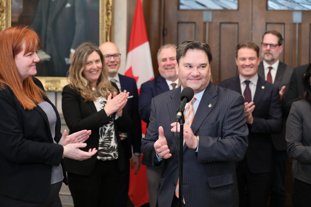 Pictured here is Don Davies, NDP MP for Vancouver Kingsway, celebrating with members of the Canadian Health Coalition and NDP caucus following the passing of Bill C-64 – The Pharmacare Act – in the House of Commons in 2024. Photo: John Major.
